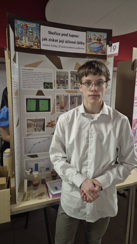 Z okresního kola do krajského kola letos postoupil za naši školu Vojta Krátký z VIII. B se svým badatelským projektem „Skořice pod lupou: jak získat její účinné látky“. V projektu se zaměřil na zkoumání vlastností skořice, způsoby získávání jejích aktivních látek a jejich možné využití.