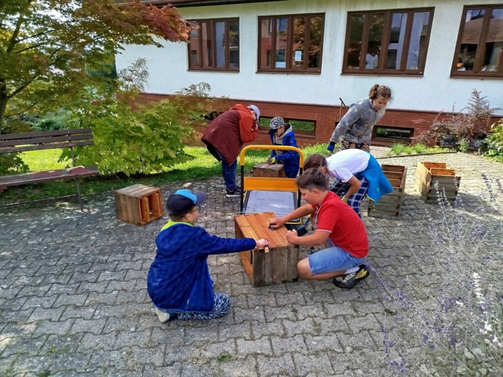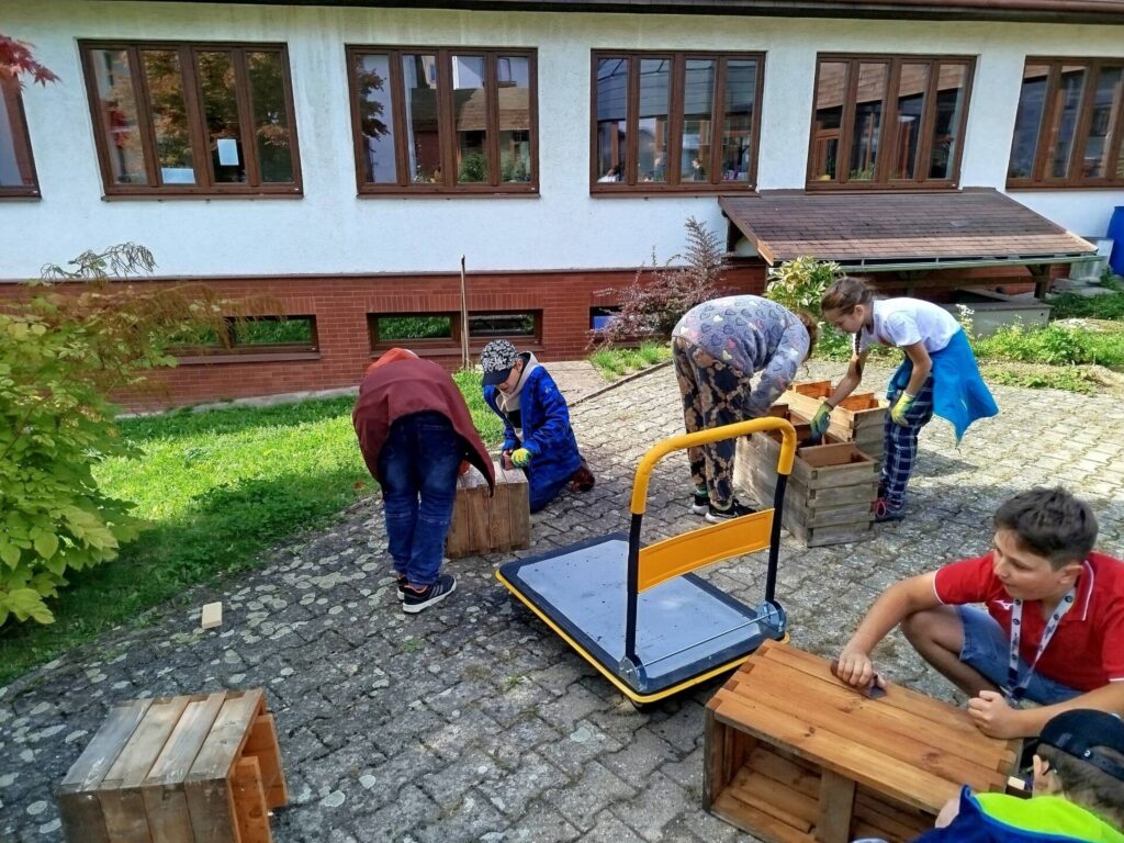 Na začátku října se žáci 5. A v hodině pracovních činností vydali pomoci zkrášlit prostředí před penzionem pro seniory. S chutí a nasazením se pustili do práce – nejprve obrousili starší dřevěné truhlíky a připravili je na nové osazení. Poté do nich vysadili květiny, které zpestří a zútulní venkovní prostor penzionu.