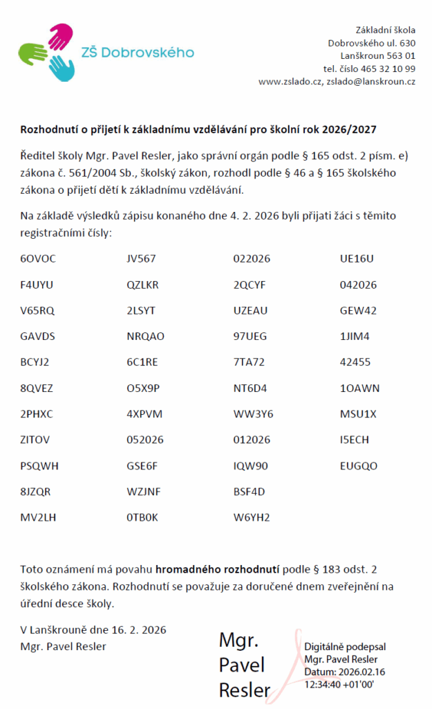 Rozhodnutí o přijetí k základnímu vzdělávání pro školní rok 2026/2027